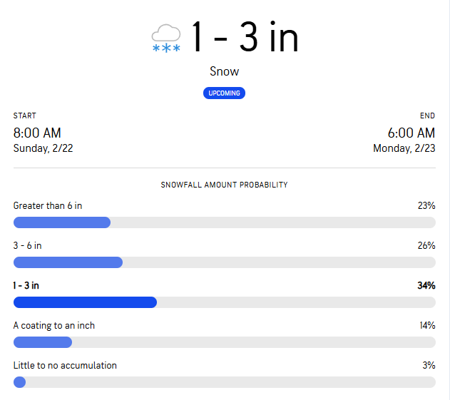 In terms of how much it could snow this weekend, there is 34% chance that the District and greater DMV area will receive between 1 and 3 inches of snow.
